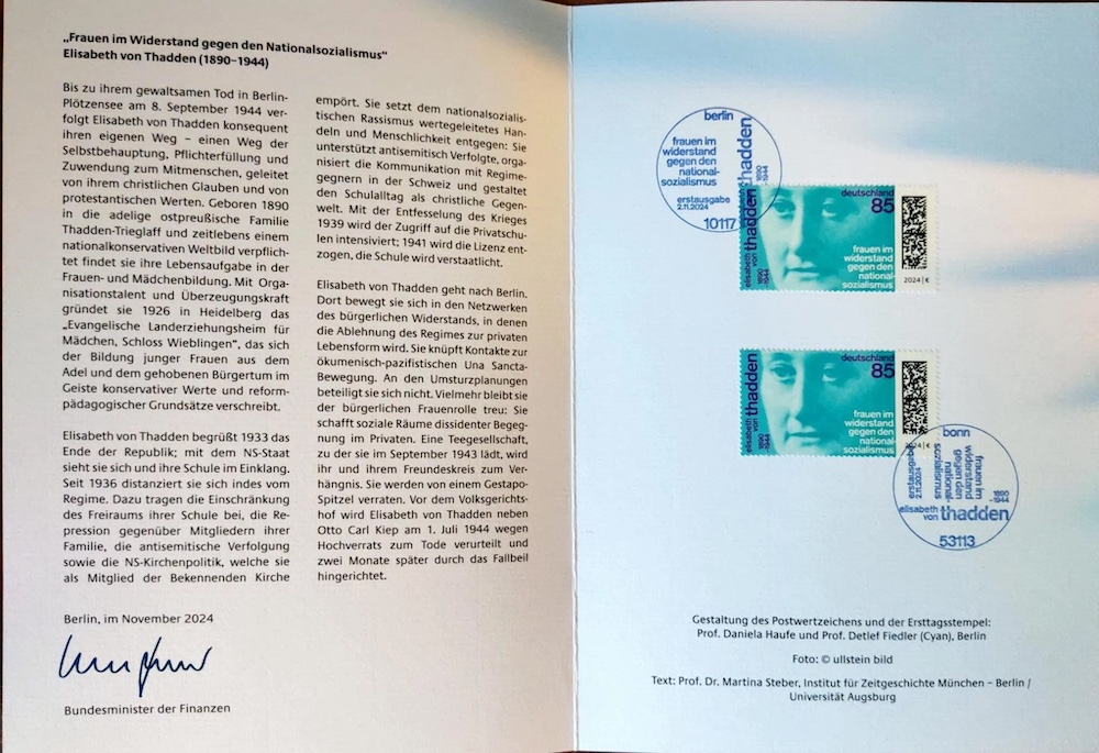 Der originale Ersttagsbrief aus der Sonderpostwertzeichen-Serie 2024 „Frauen im Widerstand gegen den Nationalsozialismus“ Elisabeth von Thadden (1890-1944) Ersttagsbrief mit zwei Briefmarken und Ersttagsstempeln aus Berlin und Bonn kann online für 18 € erworben werden.