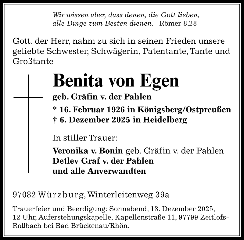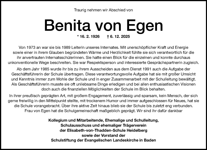 Benita von Egen war von 1973 bis 1989 Leiterin des Internats der Elisabeth-von-Thadden-Schule. Mit unerschöpflicher Kraft und Energie sowie einer an ihrem Glauben begründeten Wärme und Herzlichkeit fehlte sie sich verantwortlich für die ihr anvertrauten Internatsschülerinnen. Sie hatte einen Blick für die einzelnen und konnte durchaus unkonventionelle Wege beschreiten. Sie war Respektsperson und interessierte Gesprächspartnerin zugleich.